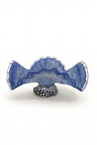 Ce plat décoratif en cristal est une véritable œuvre d’art verrier. Sa forme libre et ondulée, inspirée des coquillages, déploie de somptueuses marbrures bleu océan et blanc nacré. Il repose sur un socle sculpté argenté rappelant un corail ou un lit de perles, créant une pièce d’exception qui capte magnifiquement la lumière.