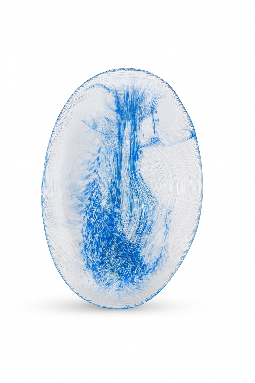 Ce plat décoratif en verre est une véritable pièce artisanale. Entièrement façonné à la main, il séduit par son jeu de transparence et ses nuances de bleu intense mêlées de touches vertes, qui semblent se diffuser comme des filaments dans la matière. Sa surface légèrement texturée et ses bords irréguliers lui donnent une allure organique et contemporaine.