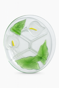 Ce plat en verre décoratif est à la fois pratique et raffiné. Il présente quatre compartiments séparés, parfaits pour servir des amuse-bouches, fruits secs ou petits accompagnements. Son décor délicat de fleurs de calla blanches et de feuilles vertes en relief lui confère une élégance naturelle, idéale pour sublimer une table.
