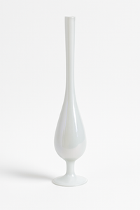 Ce vase en verre opalin blanc irisé se distingue par son design élancé et minimaliste. Sa silhouette longiligne, posée sur un pied délicatement évasé, capte la lumière pour révéler de subtils reflets nacrés aux nuances changeantes. Une pièce à la fois raffinée et contemporaine, idéale pour accueillir une tige unique, une fleur séchée ou simplement être exposée en objet décoratif.