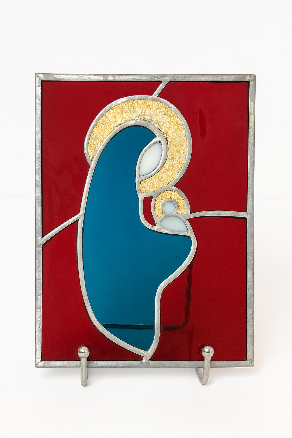 Ce vitrail artisanal, inspiré de l’art sacré, représente la Vierge à l’Enfant dans un style épuré et contemporain. Les couleurs intenses – rouge profond, bleu canard et rehauts d’or – créent un jeu de lumière saisissant, idéal pour un espace de méditation ou une décoration raffinée.
